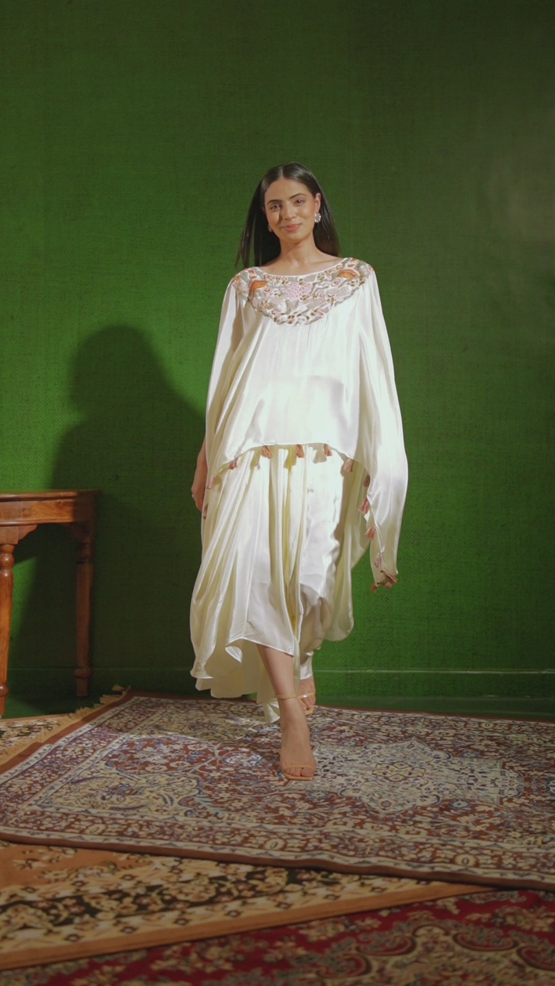 Introducing our Ivory embroidered habutai silk high-low kaftan. Expertly crafted with intricate sequin, bead, zari, aari and thread tassels. Paired with a matching solid crop top and asymmetrical pleated draped skirt. Apt for semi formal wear.