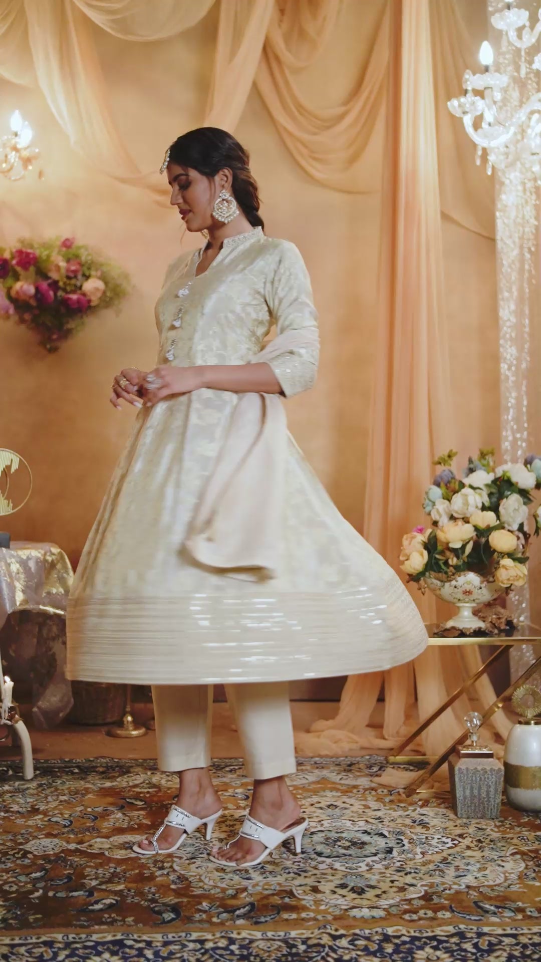 Step into the world of grace with our ivory embellished dola silk kurta pants set redefining modern elegance. This ensemble features a kurta adorned with brocade, zardosi and sequins work. Paired with matching premium silk pants and matching embellished dupatta with tassels on border. Perfect for semi-formal occasions.