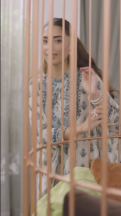 Embrace effortless charm with this Ivory kaftan-style kurta set, featuring a vibrant teal ethnic print and delicate stone handwork. Its flowing silhouette paired with printed palazzos creates a breezy, chic look perfect for day events or cozy get-togethers. Step into playful elegance and make every moment stylishly comfortable.
