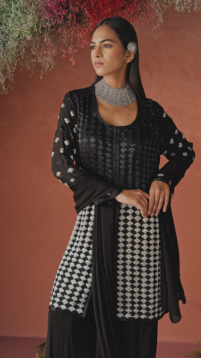 This is a stylish three-piece set featuring a black and white kurta, palazzo pants, and a dupatta, crafted from Chinon silk.