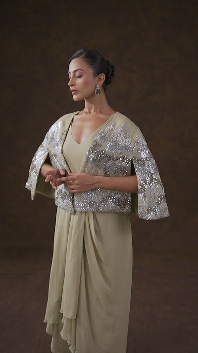This fusion ensemble perfectly balances the understated elegance of the draped dress with the rich, festive glamour of the hand-embellished cape.