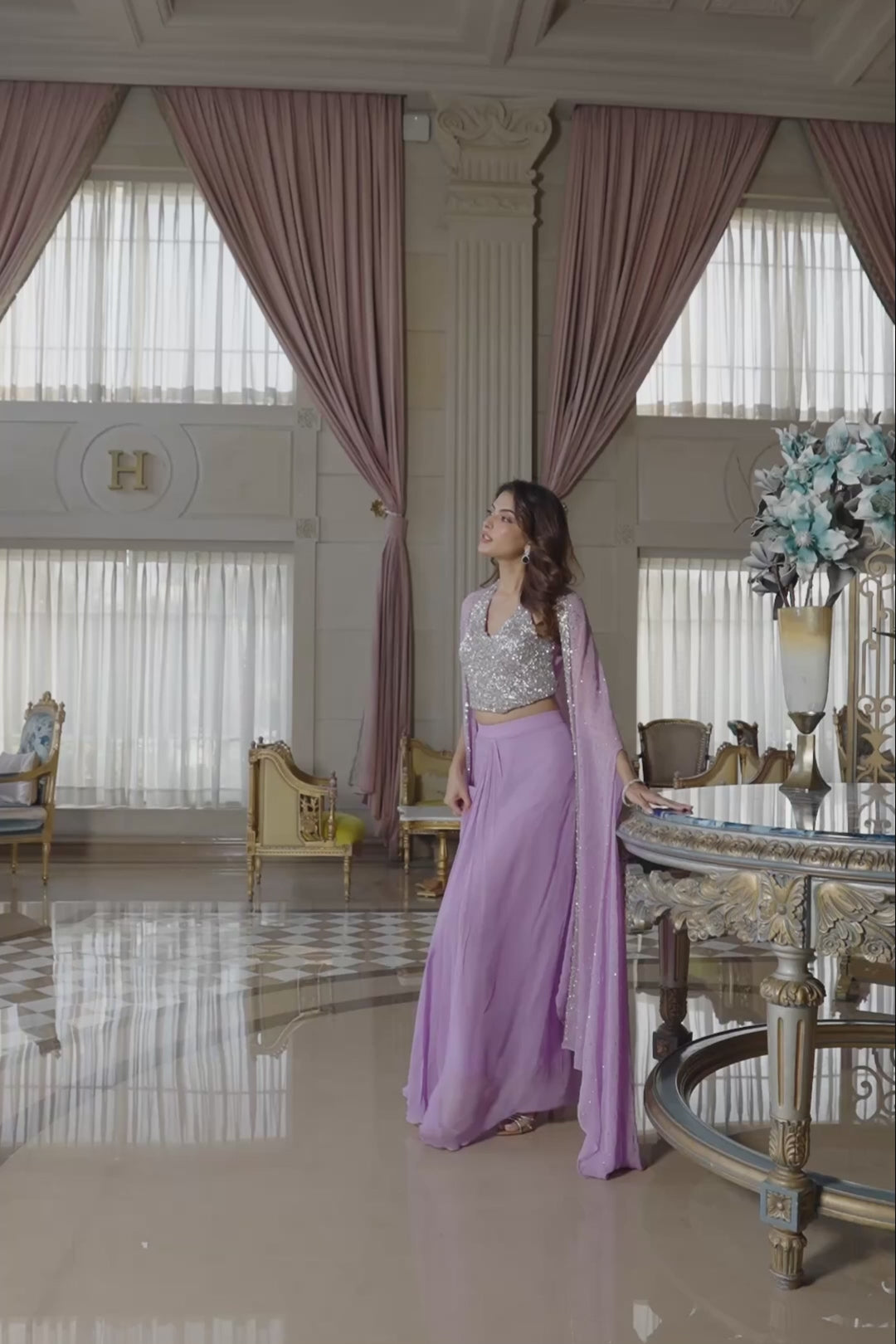 An exquisite Lavender Georgette Silk Cape Set featuring a flowing draped skirt and a halter-neck padded crop top. The ensemble is defined by the densely embellishments and heavy detailing.