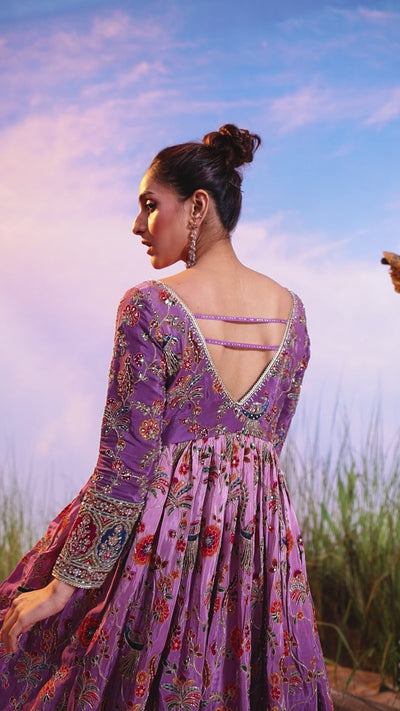 Make a graceful and impactful statement in this single-piece Anarkali gown. Crafted from rich Uppada Silk, this full-sleeved gown features a beautiful lavender hue and is covered entirely in vibrant, intricate hand-embellishment, making it a perfect choice for weddings or grand evening events.