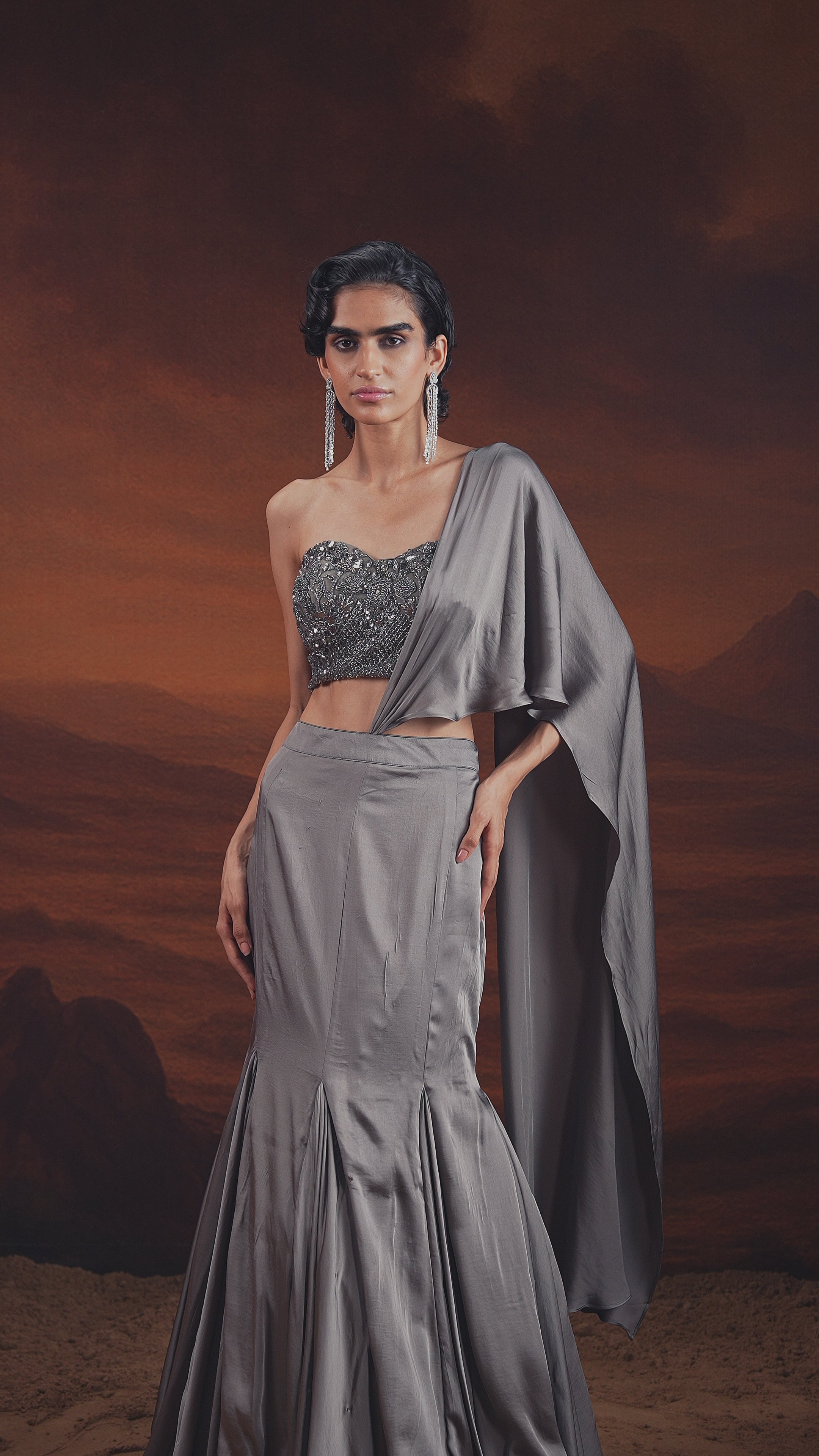 Make a breathtaking statement in this gorgeous Slate Gray Satin Silk Set. The ensemble features a stylish fish-cut skirt with a beautiful attached dupatta-cape that drapes gracefully. The look is completed with a stunning, intricately hand-embellished one-shoulder blouse with drawstrings at the back.