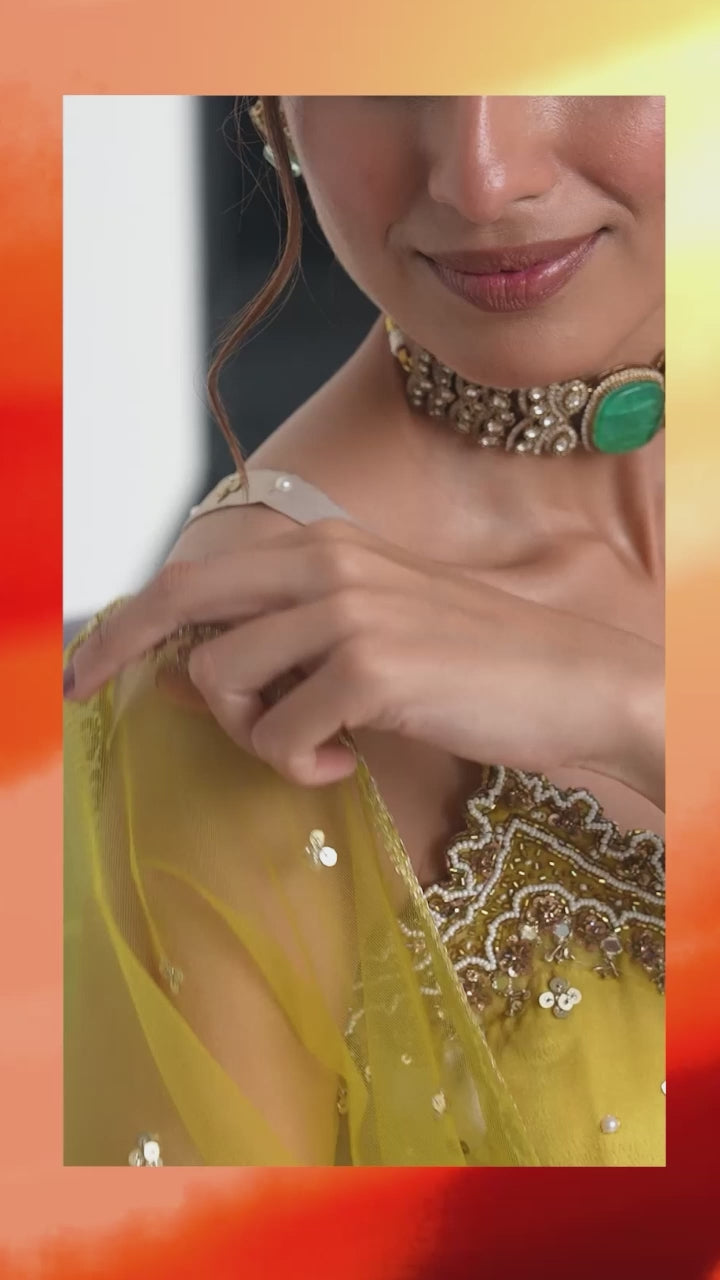 Embrace the festive spirit with this lively and elegant yellow-ivory Anarkali set. Featuring a modern cut blended with traditional flair, it’s adorned with hand-embroidered pearls and sequins that sparkle as you move. Its comfortable, flared design makes it ideal for celebrations like Rakhi, Teej, or Haldi. The soft, lightly embellished net dupatta adds a touch of grace. Made from luxurious silk with mirror, bead, cut dana, and sequin details, the panelled silhouette flows beautifully. Pair it with bold earrings or a choker for a fun, royal vibe that’s sure to turn heads.