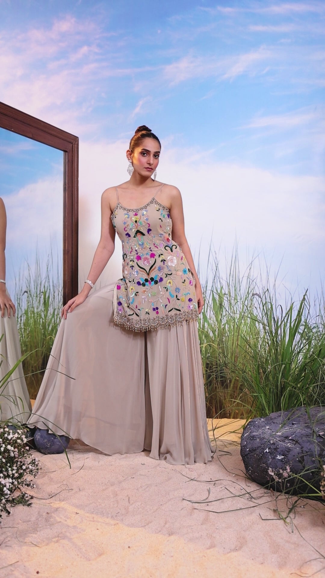 This effortlessly elegant Kurta and Flared Palazzo Set is crafted from flowing Georgette Silk in a serene neutral shade. The top is beautifully distinguished by a dense, artistic multi-color embroidery of sequins, beads, cut dana, and stones, creating a vibrant focal point over the subtle base.