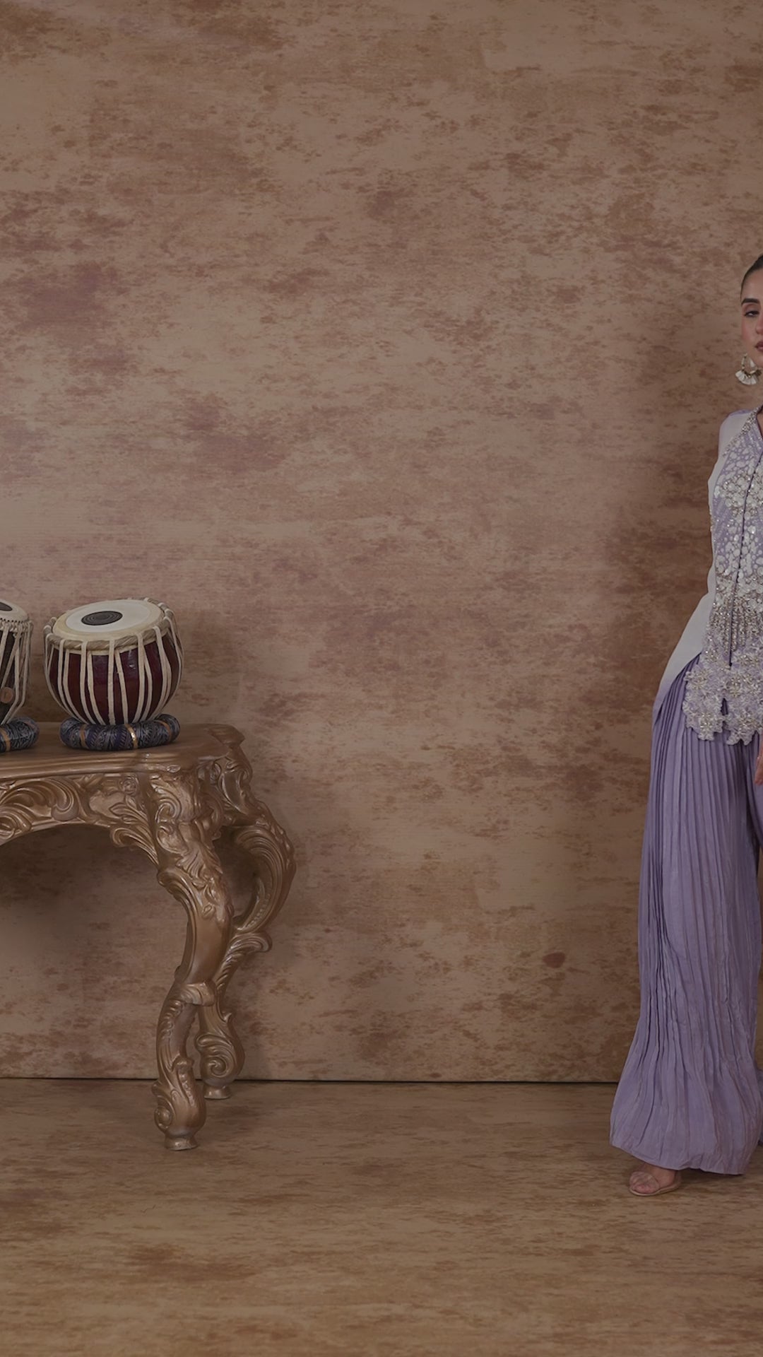 Introducing our stunning Lilac Ombre-Dyed Georgette Silk Tunic & Palazzo Set. This exquisite ensemble features a beautifully designed tunic with an attached crop top, adorned with intricate sequin, bead, and cut dana handwork that adds a touch of elegance. The matching solid pleated crepe silk palazzo complements the tunic perfectly, making it ideal for semi-formal occasions.