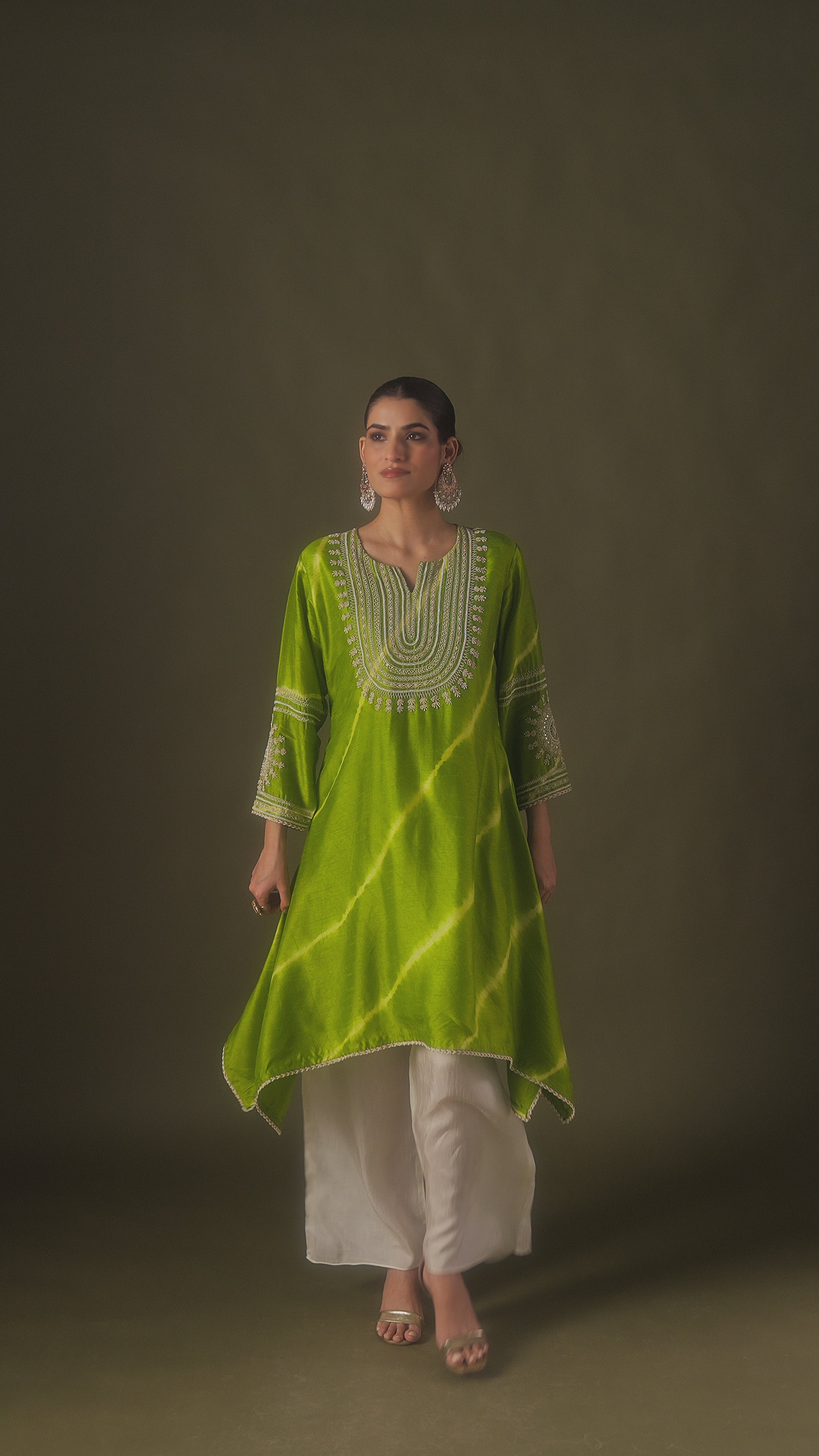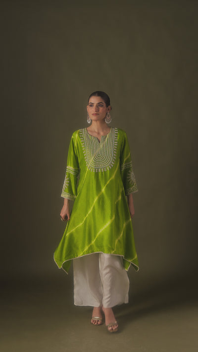 A vibrant lime green A-symmetrical kurta crafted in lustrous fabric with leheriya pattern. The high-low hemline adds a contemporary twist to a traditional silhouette. Features exquisite hand embroidery on the neckline with beads, sequins, and golden threadwork. Intricately embellished sleeves bring added richness and detail to the overall look Paired with elegant ivory straight pants for a subtle contrast and balance.