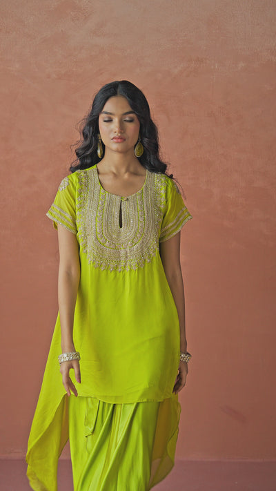 Radiate fresh, vibrant energy in this striking Lime Green Set. This two-piece ensemble features a short, sheer organza silk kurta with an intricately hand-embellished yoke adorned with sequins, golden thread, and beads. It is perfectly paired with a beautifully draped satin silk skirt, creating an elegant fusion of flowing textures.