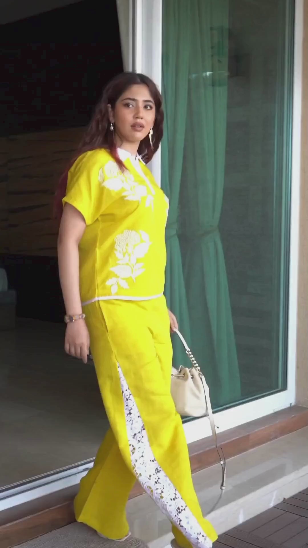 - A soft symphony of yellow and white stitched in linen ensemble.