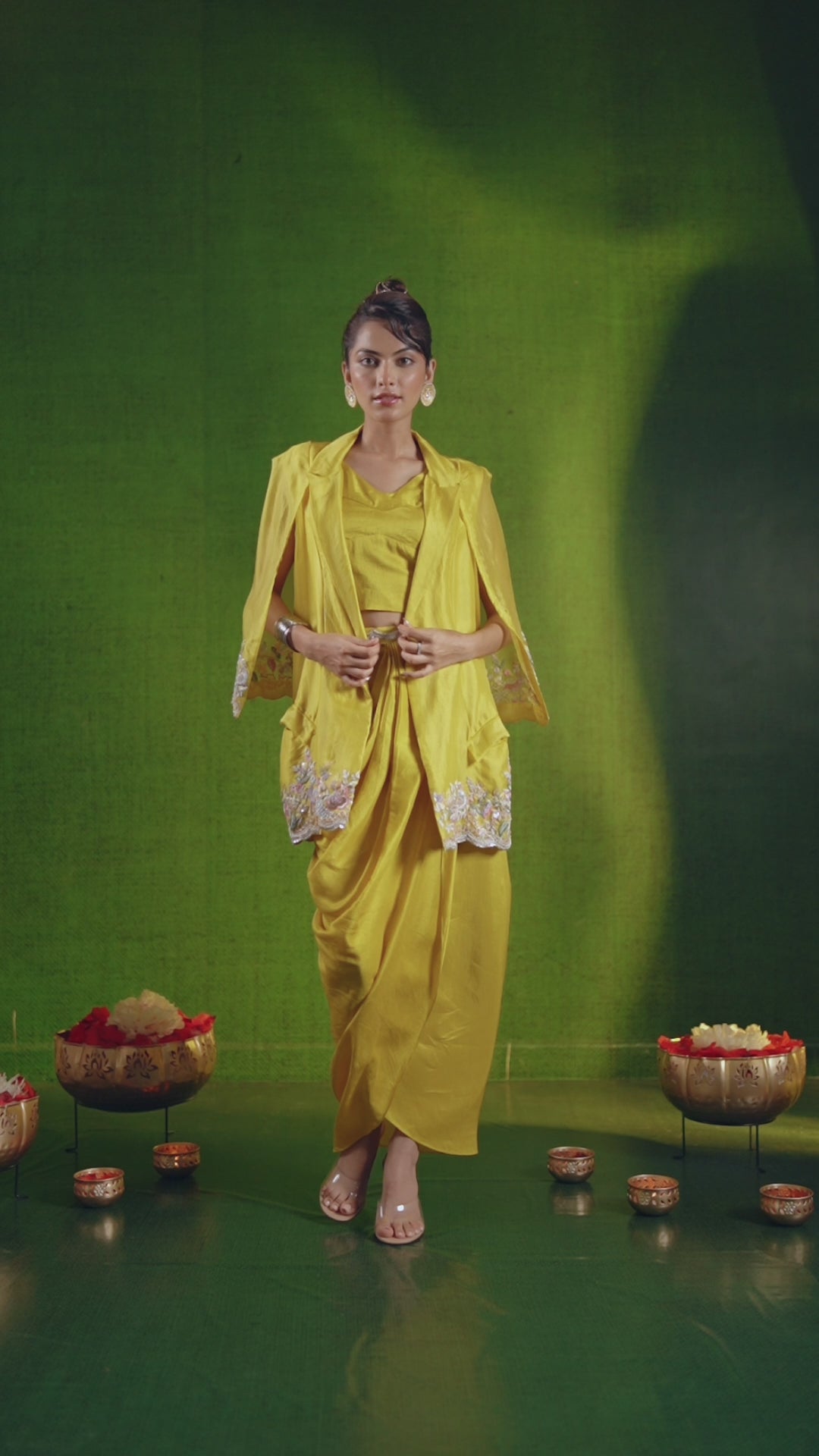 Expand your festive wardrobe with our aesthetically beautiful ensemble, that features Lime Yellow modern and stylish organza silk jacket with embellished cape sleeves and exquisite work of zari, aari tari, sequins and resham thread embroidery. Paired with matching solid crop top and a drape skirt with work on waist. This intricate design with contemporary flair is your key to unforgettable charm.