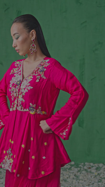 Magenta Pink Embellished and Padded Peplum Top With Draped Skirt.