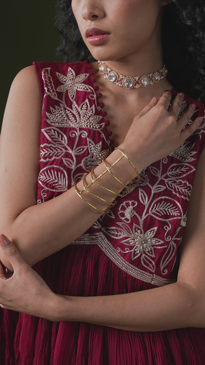Work: Zari, sequins, golden thread work, beads, and detailed handwork along the neckline and waist
