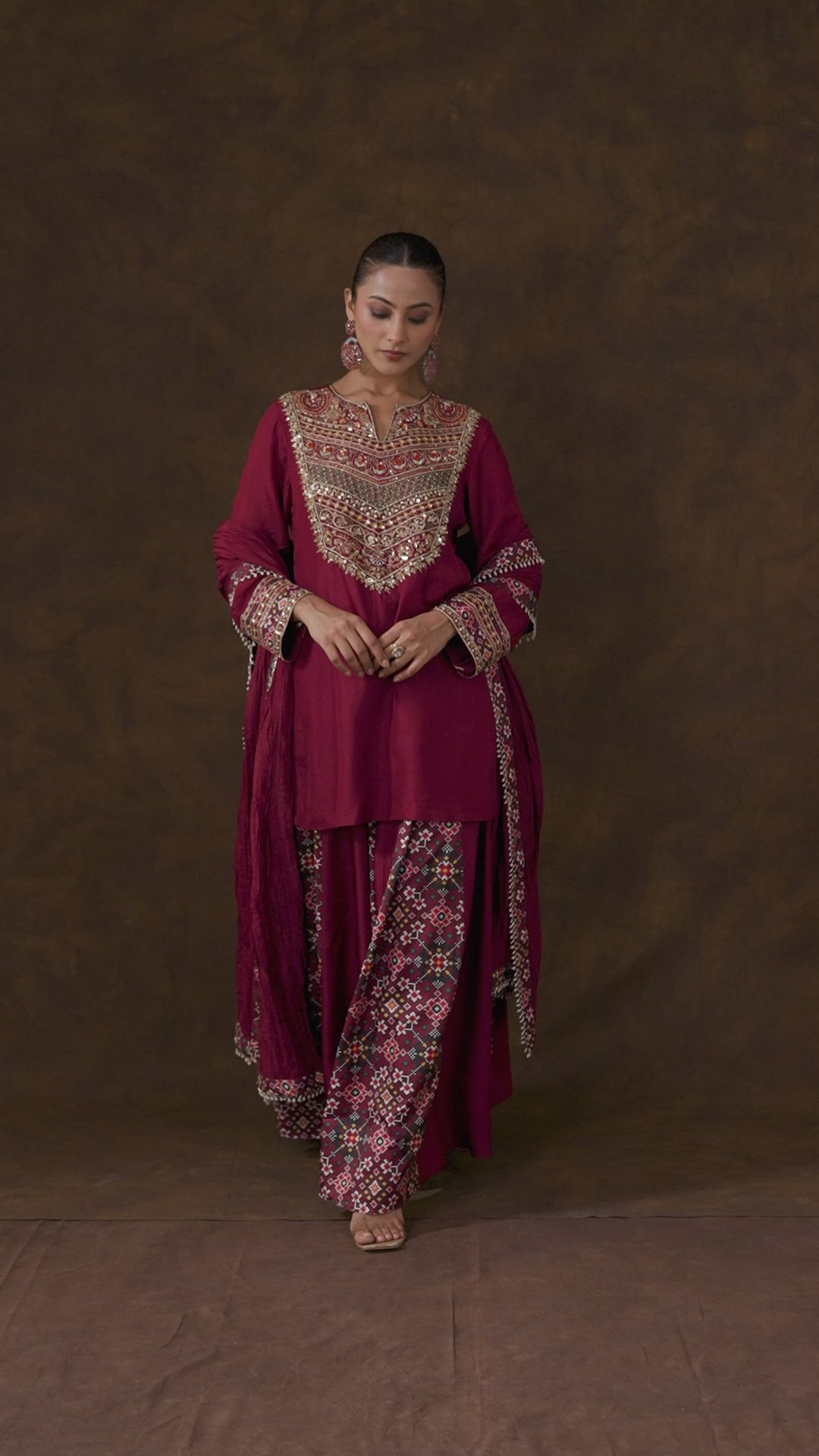 Magestic Maroon Embellished Raw Silk Palazzo Set