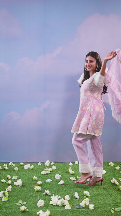 A feminine mauve ensemble featuring a short flared tunic with voluminous sharara pants. The look is defined by dense pastel floral embroidery and wide crochet lace borders, creating a romantic, breezy aesthetic.