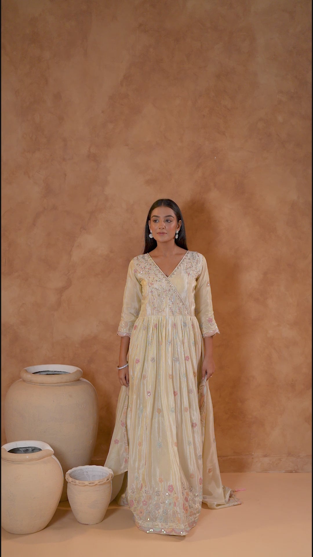 This ethereal Anarkali suit and dupatta set is characterized by its lovely, flowing silhouette. The Anarkali is delicately embellished with multi-colored handwork, which is mirrored on the dupatta's two-sided heavy border, creating a richly detailed and elegant look.