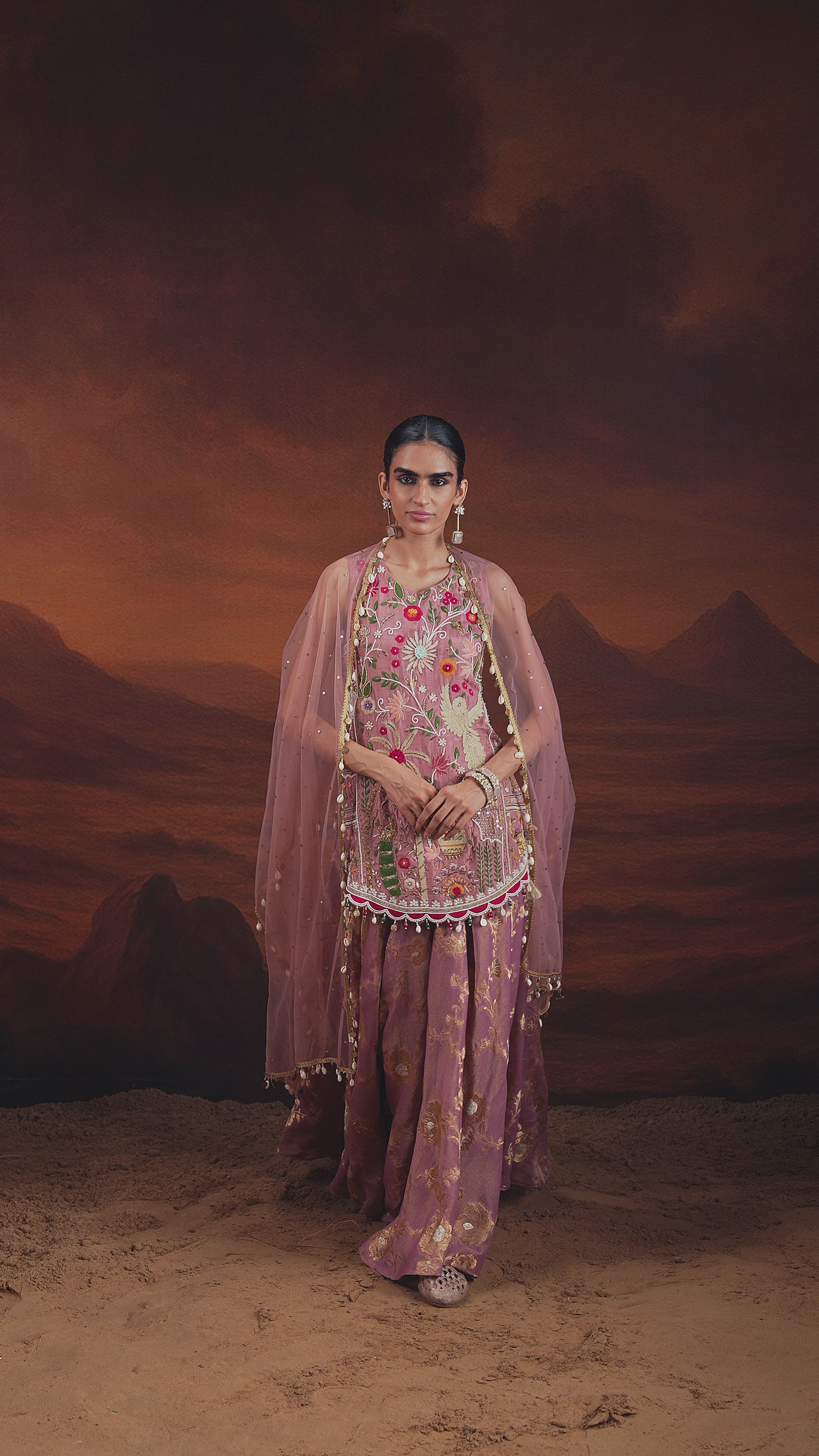 Mauve Pink Embellished Shimmer Tissue Silk Palazzo Set