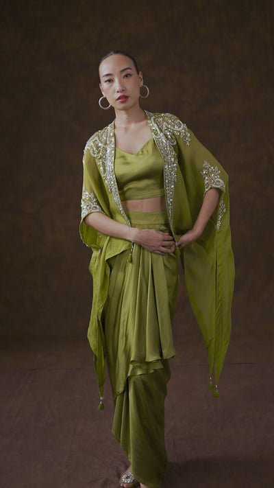 Mehendi Green Embellished Satin Silk Cape Set