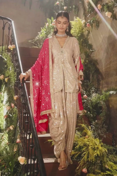 This glamorous champagne-beige ensemble features a modern Indo-western silhouette, showcasing a front-slit tunic paired with a draped dhoti-style pant. The outfit is opulently detailed with all-over sequin embellishments and a heavily worked V-neckline featuring intricate golden lace work and sequin accents. Completed with a contrasting vibrant pink dupatta adorned with matching sequin borders, this set offers a high-fashion, regal look perfect for grand evening celebrations.