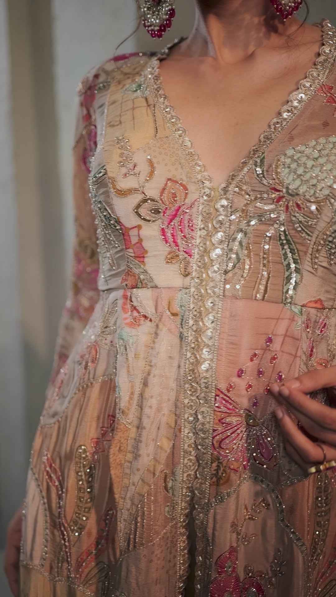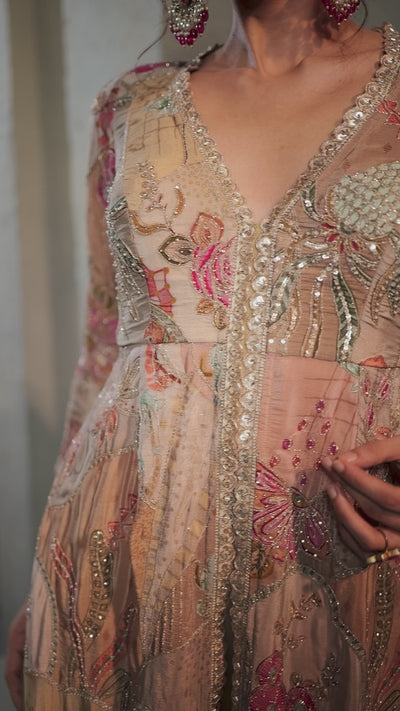 The long, front-slit kurta features elaborate, multi-colored paisley and floral prints that are lavishly overlaid with shimmering sequins, beads, and fine silver zari work.