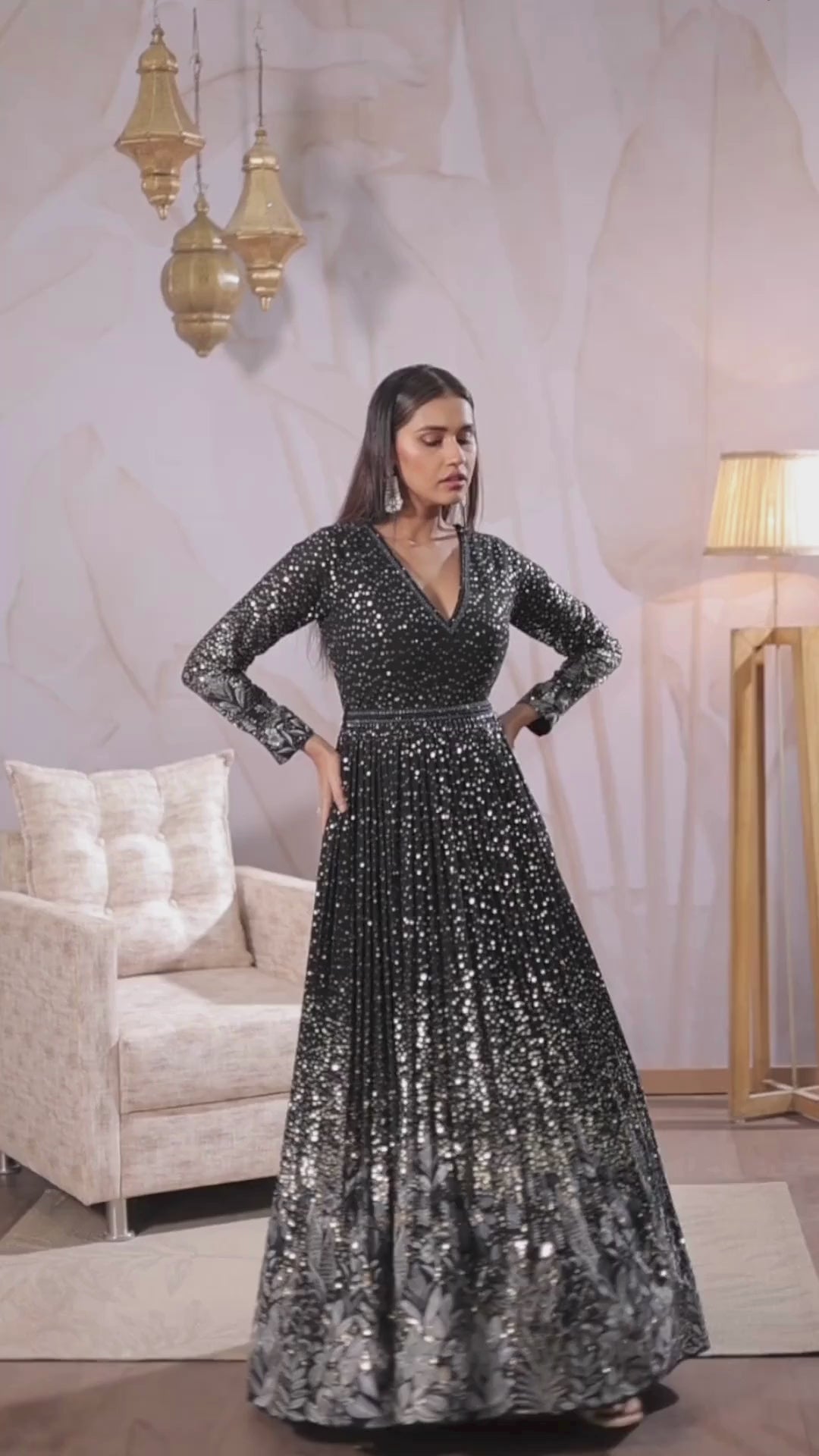 Introducing our Midnight Black Sequin Embellished Italian Silk Gown. This exquisite piece features full embellishments with sequins, thread, beads and aari tari handwork, creating a stunning effect. Complete with a chic belt, this gown is perfect for elegant evening events, ensuring you make a statement wherever you go. Elevate your wardrobe with this show-stopping design.