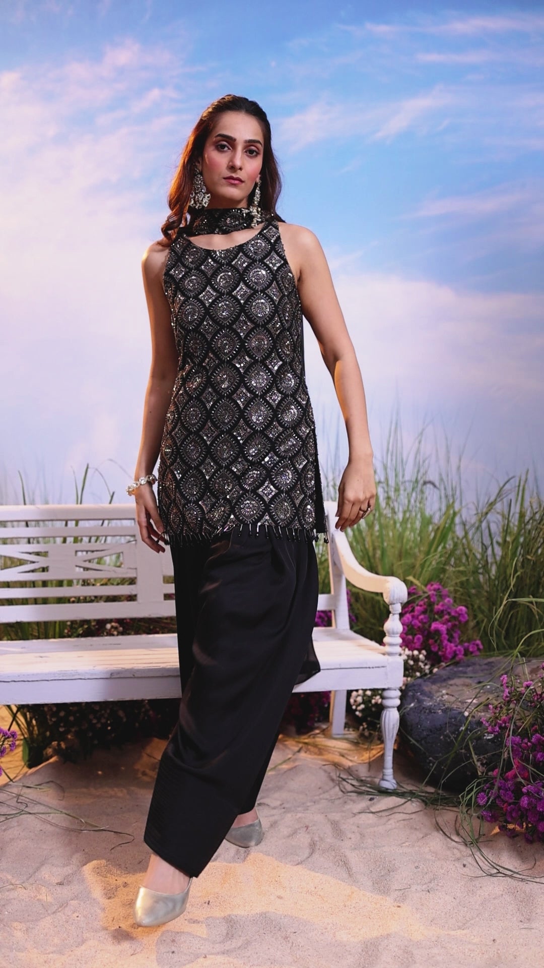 This is a stunning Indo-Western set featuring a sleeveless short kurta heavily embellished with sequins, beads, and cut dana in a detailed pattern, perfectly contrasted by flowing black satin Salwar pants and a sheer black chiffon dupatta.
