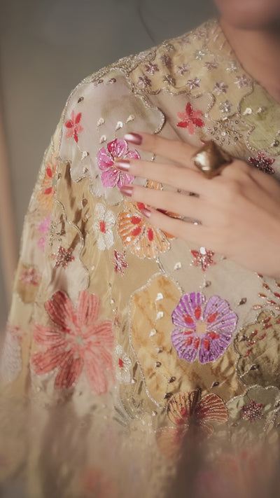 This elegant two-piece set is rendered in an earthy tone, featuring a flowy crepe silk palazzo paired with a striking one-shoulder tunic. The top is beautifully adorned with intricate colorful floral motifs, sparkling sequins, decorative coins, and golden zari work.