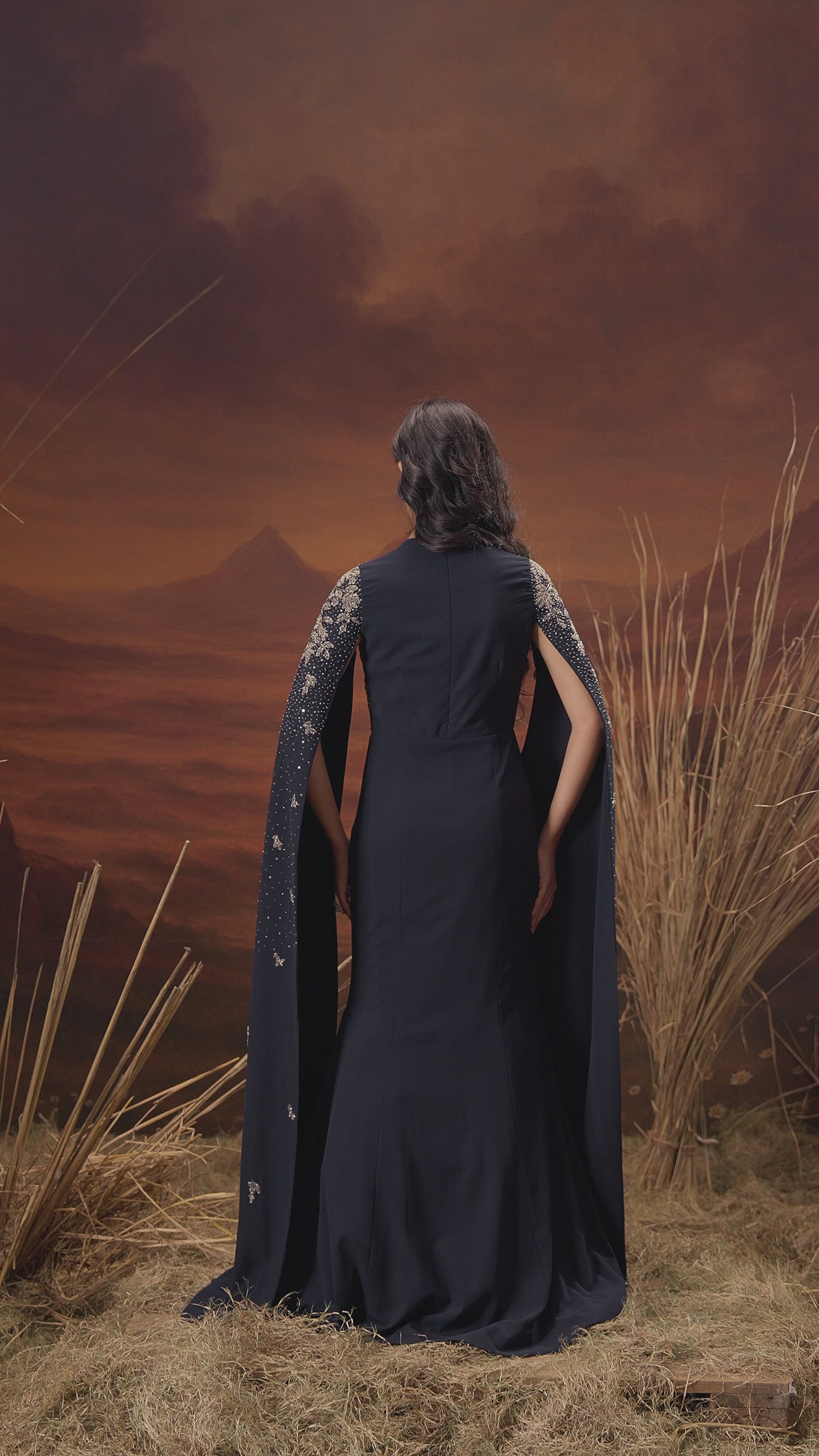 Grace any evening affair with this captivating Navy/Midnight Blue Georgette Silk Gown, featuring a dramatic and elegant silhouette with cascading, embellished sleeves.