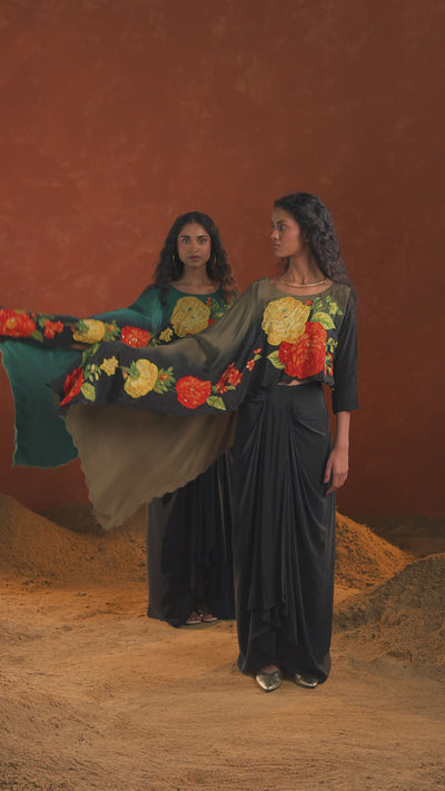 This striking ensemble features a midnight olive satin silk drape skirt paired with a coordinated crop top and a dramatic one-sided fall. Intricately adorned with patchwork florals, sequins, cut dana, and thread embroidery, the look is a celebration of rich textures and contemporary elegance.