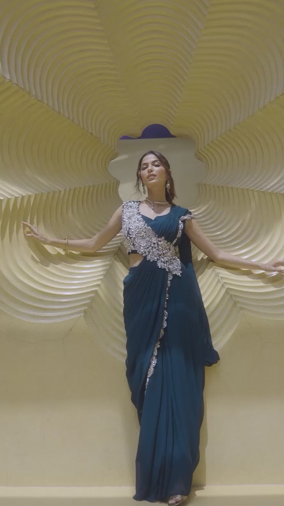Exude breathtaking glamour in this majestic Midnight Teal Saree Set. This two-piece ensemble features a gracefully draped saree crafted from flowing georgette silk for a flawless, modern silhouette. The look is completed by a stunning padded crop top blouse and waist panel, exquisitely embellished with rich gold cut dana, sequins, beads, and Zari handwork, creating a show-stopping look for any evening affair.