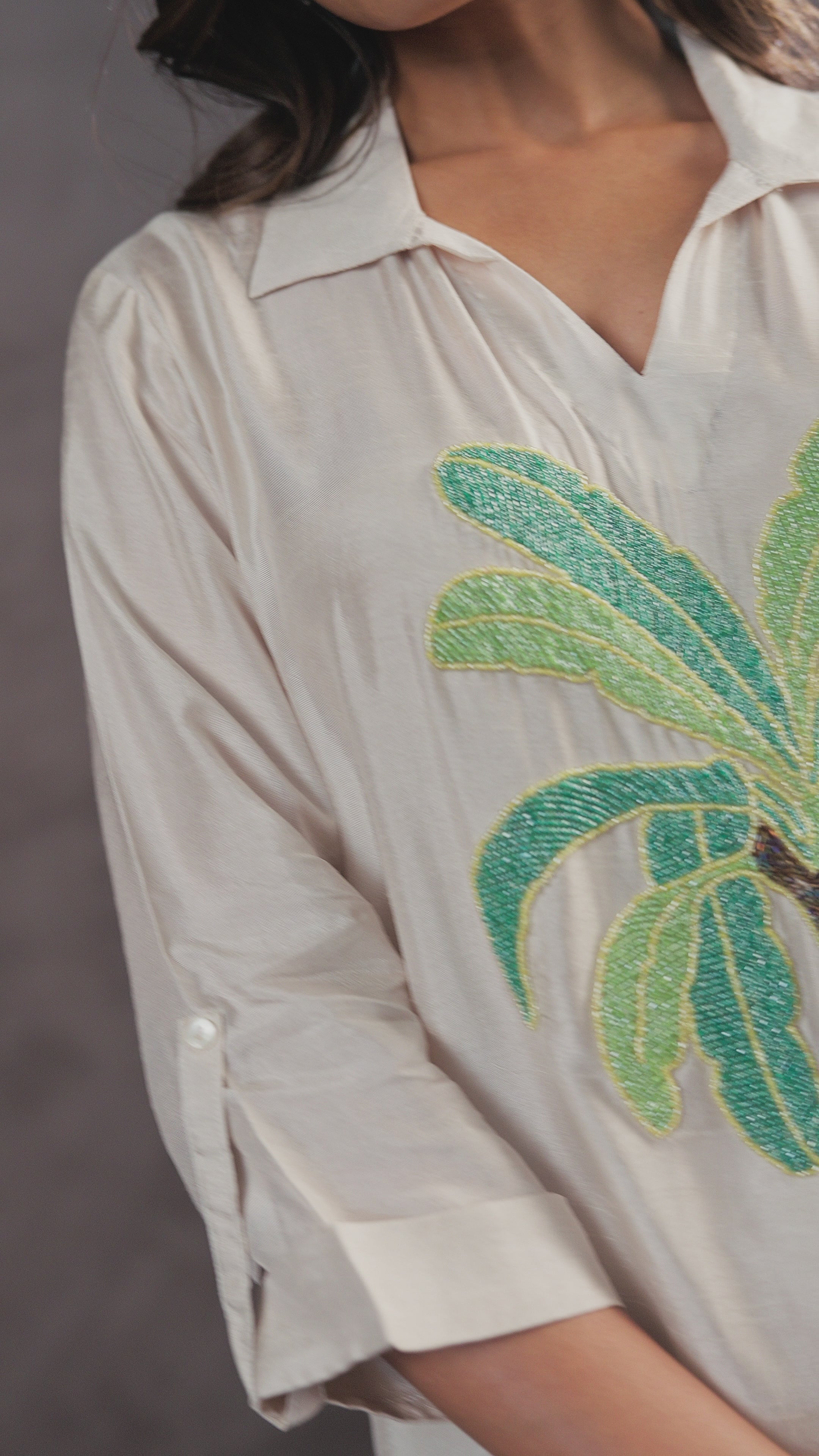 Make a statement in this Light Champagne raw silk kurta set, featuring intricate bead and cut dana embellishments in a tropical motif. The kurta is paired with a solid crop top and matching pants finished with fine thread embroidery at the hem. A refined blend of artisanal detail and contemporary silhouette, perfect for festive evenings.