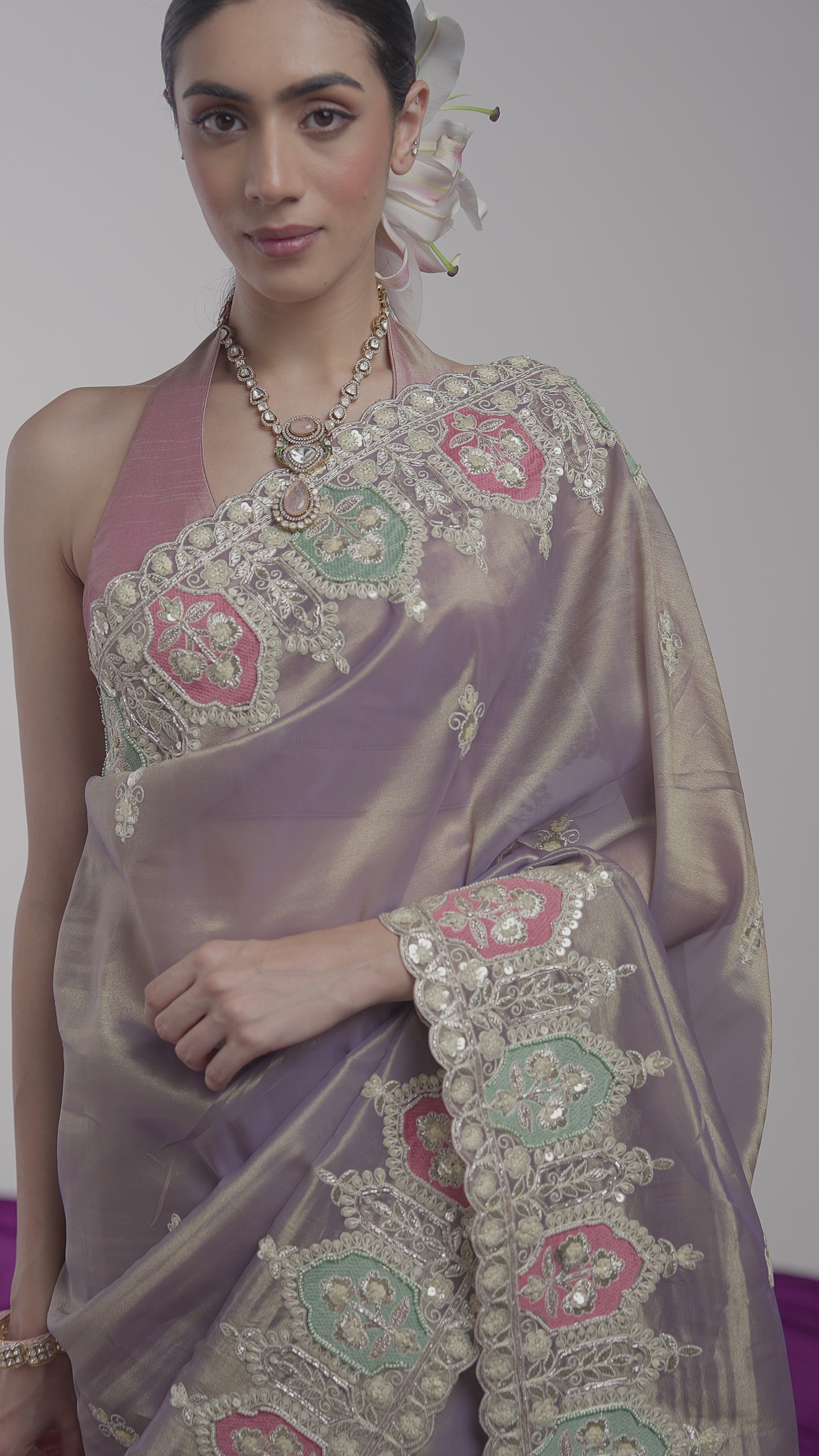 Exude ethereal beauty in this mesmerizing Moonlit Mauve Saree, a stunning display of color and light. Crafted from shimmering tissue silk, the fluid drape is enhanced by exquisite, multi-hued hand-embroidery, making it perfect for a sophisticated evening.