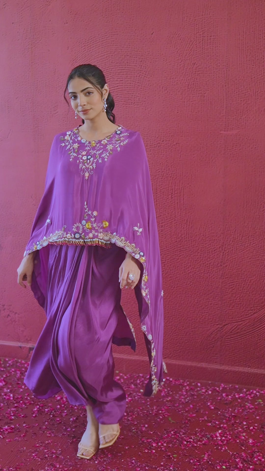 Introducing our Mulberry Pink embroidered Spanish silk draped skirt. Expertly crafted with intricate sequin, zari, bead and thread handwork. Paired with a matching solid padded crop top and an attached cape. Apt for semi formal wear.