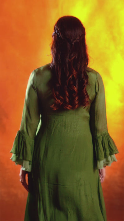 This chinon silk kurta and palazzo set features a Deep Moss Green color-block design, with dramatic ruffled bell sleeves. The yoke is beautifully decorated with rich embroidery, sequins, beads, and colorful threadwork.