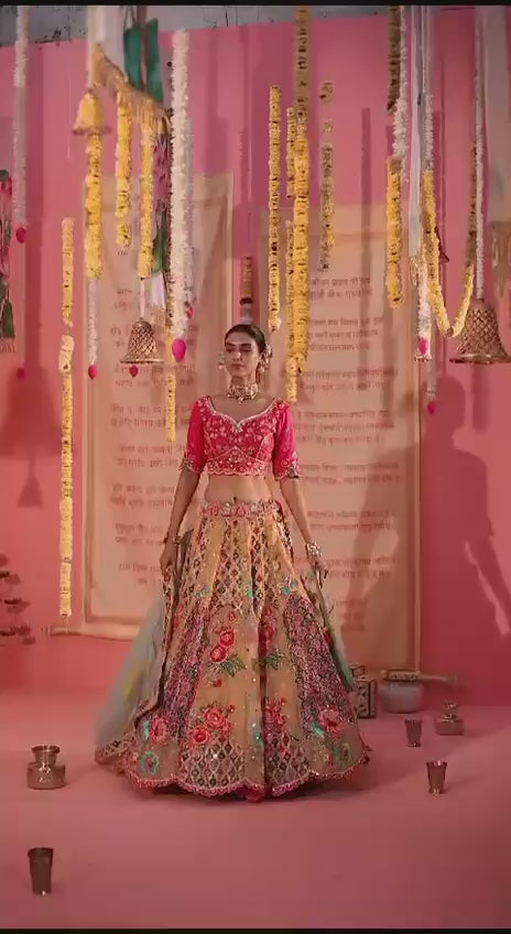 This multi-color embellished Banarasi silk lehenga set is adorned with intricate beadwork, aari tari, zardozi, sequins, cut dana and zari handwork on the lehenga. It comes with an unstitch blouse and is paired with a beautifully matching dupatta, offering a harmonious blend of tradition and elegance. The vibrant colors and detailed craftsmanship make it a perfect choice for festive occasions and weddings.