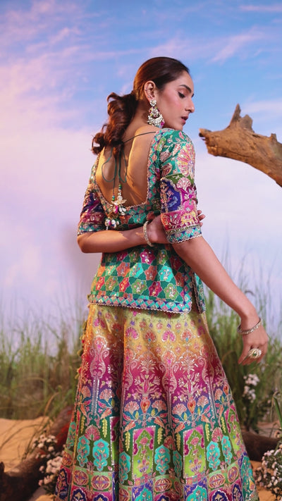 Make a dazzling statement in this vibrant two-piece set, featuring a captivating mix of colors, traditional prints, and extensive hand-embellishment. The set includes a fitted Short Kurta/Top with elbow-length sleeves and a voluminous Wide-Legged Palazzo, both crafted from luxurious premium silk.