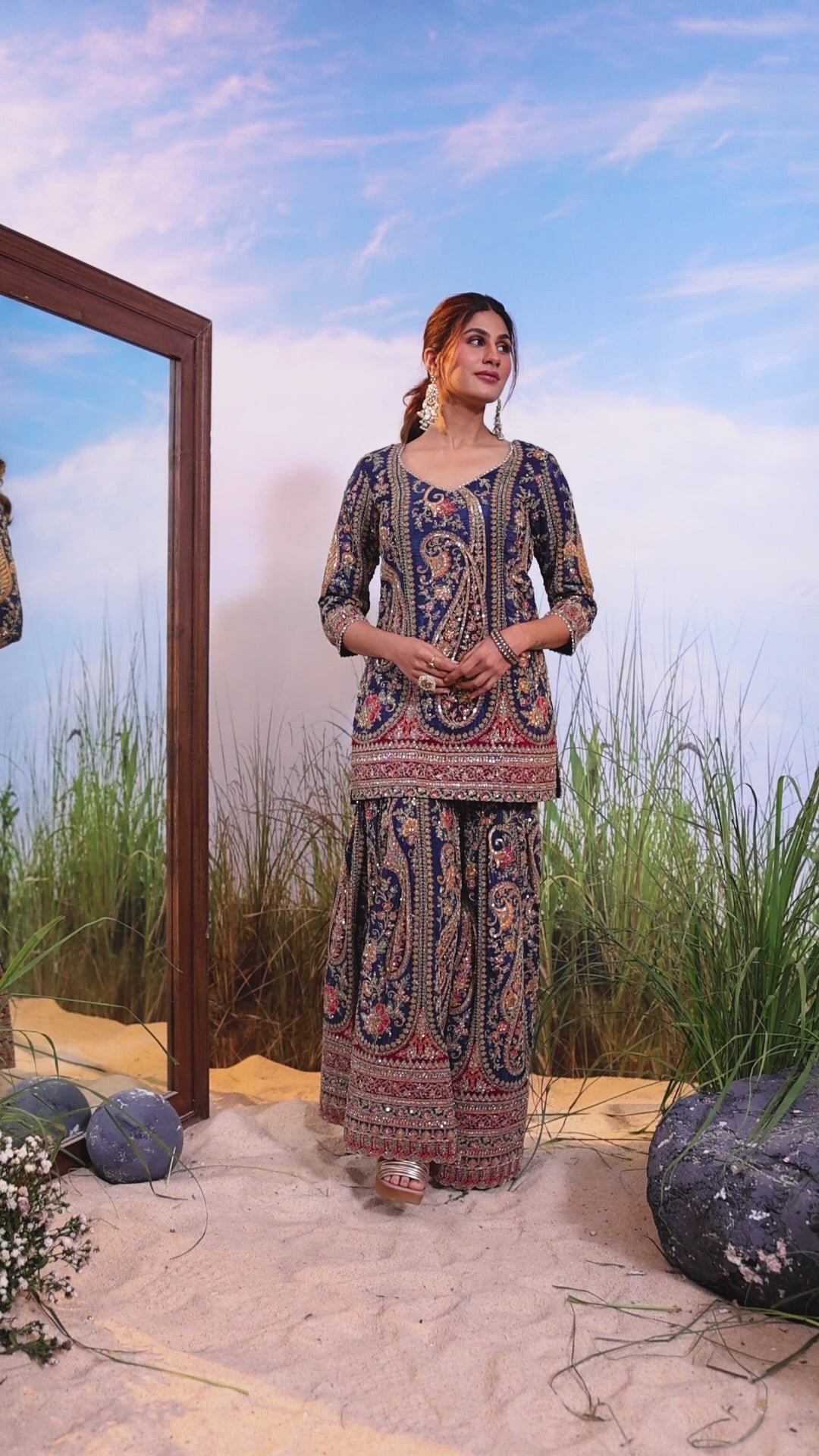 This magnificent Navy Blue Kurta and Sharara Set is a masterpiece of craftsmanship, featuring dense, heavy multi-color embroidery in a detailed paisley pattern. The raw silk fabric is richly embellished with glittering sequins and stone work, creating a regal and intricate look.