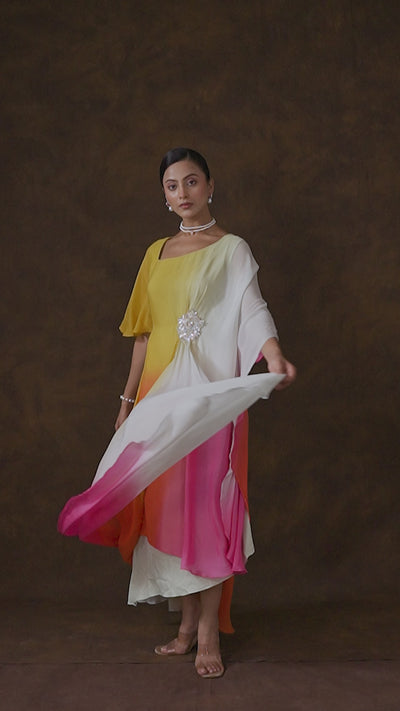 Make a vibrant, resort-chic statement in this unique Multi-Color Ombré Dress. This single-piece dress is crafted from flowing georgette silk, showcasing a stunning color melt of Yellow, Orange, Pink, and Mint Green. The fluid, asymmetrical kaftan style silhouette is elegantly draped and cinched at the waist with a dazzling, brooch-like motif of sequins, cut dana, and bead handwork.