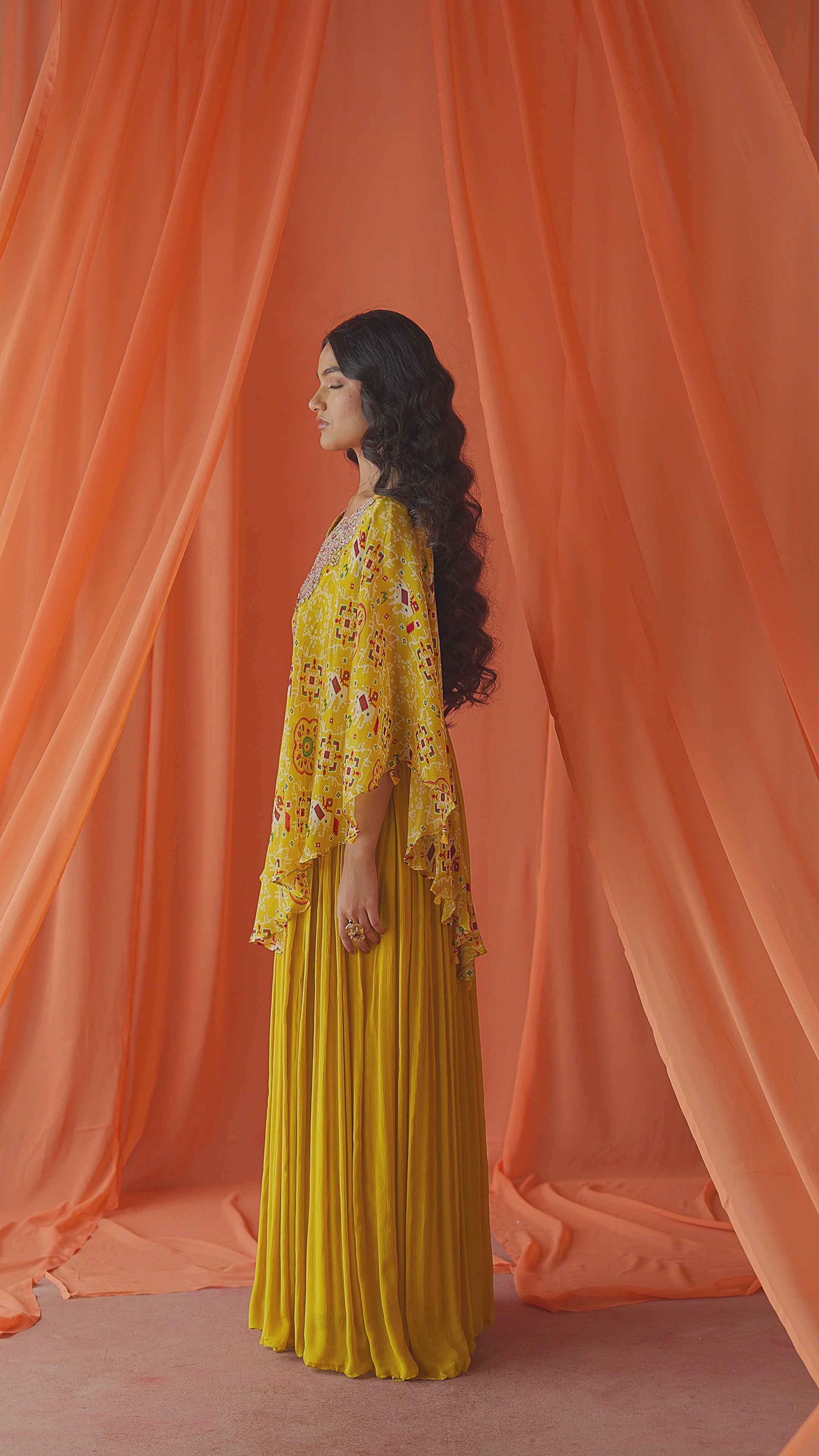 Elevate your festive style with this stunning mustard yellow full gown set in flowy Chinon silk fabric. Adorned with rich thread embroidery, gota patti, zari, sequins, and delicate beadwork, it radiates traditional charm. The intricate craftsmanship makes it a perfect pick for weddings, haldi, or festive celebrations. Comfortable, elegant, and effortlessly stylish.
