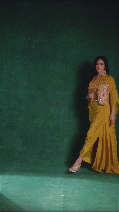 Make a sleek, sophisticated statement in this Mustard Yellow Set. The three-piece ensemble features a dramatically draped skirt, a crop top, and a lightweight jacket with contrasting floral handwork.
