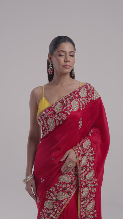 Step into refined sophistication with this Rose Red Silk Saree, a striking fusion of tradition and timeless grandeur. Crafted from rich premium silk, the saree radiates a bold yet graceful charm, making it an impeccable choice for weddings, festive celebrations, and grand occasions.