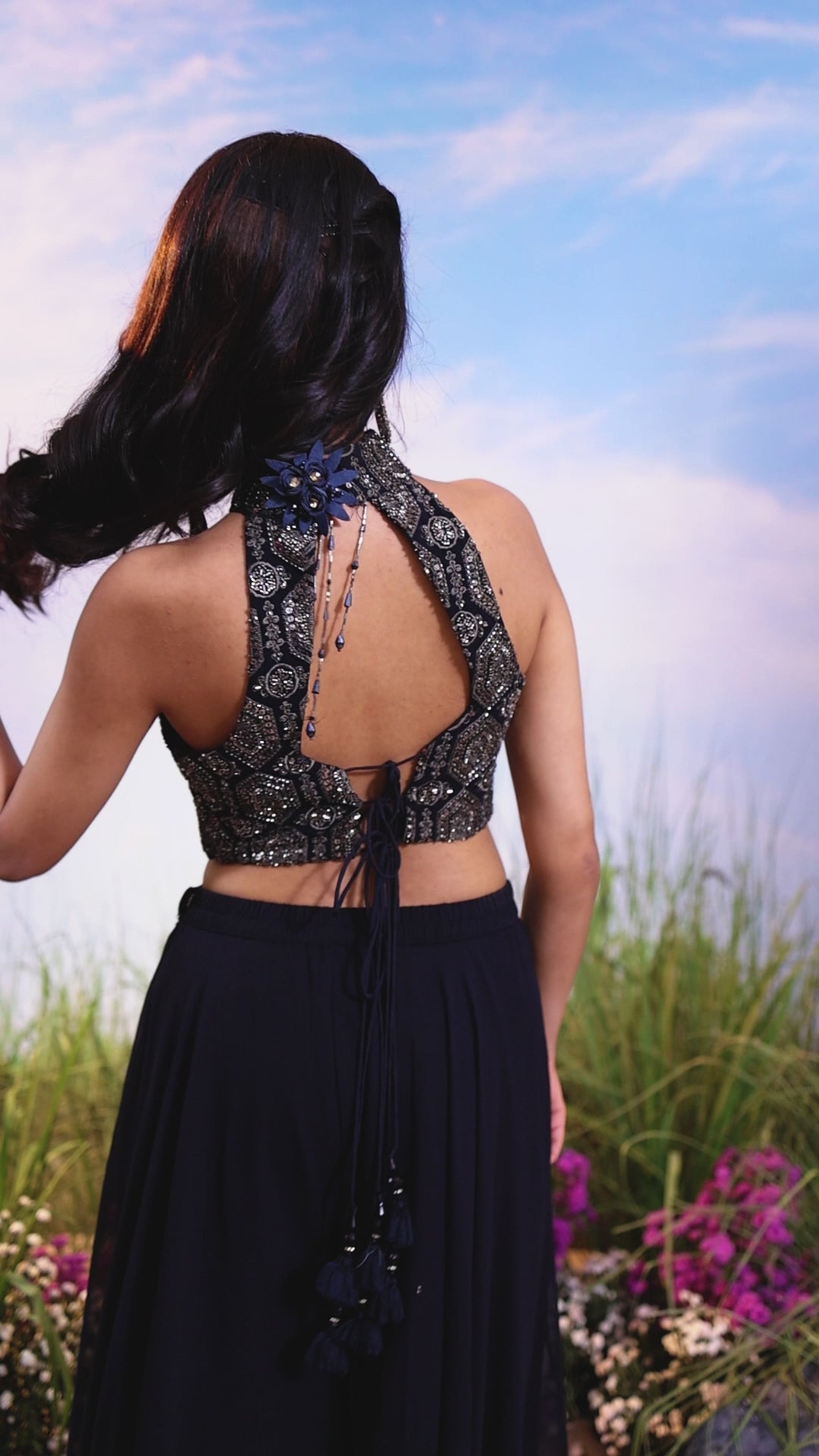 This sophisticated two-piece set is perfect for cocktail parties and evening events. It features a heavily hand-embroidered, halter-neck Crop Top Blouse with a keyhole detail and a brooch-style neck embellishment, paired with a voluminous, wide-legged Palazzo, both crafted from flowing Georgette Silk.