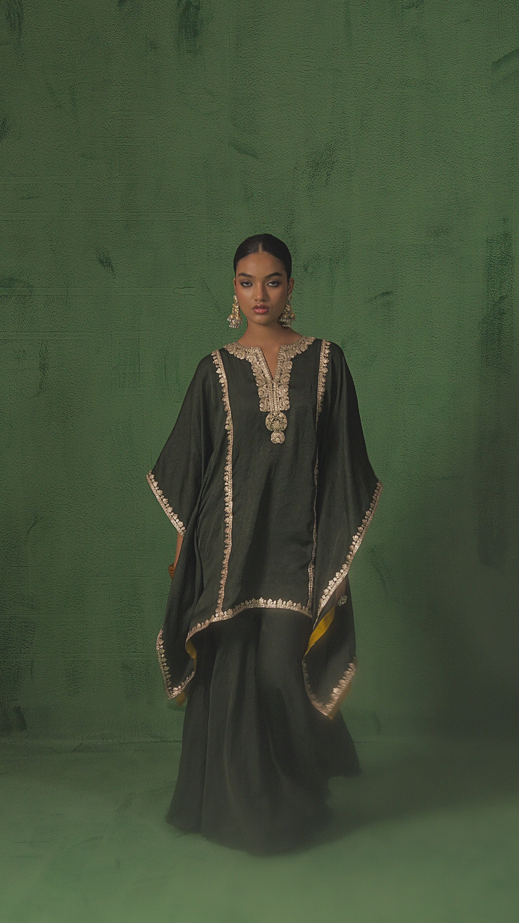 Elevate your festive wardrobe with this Deep Green two-piece set crafted in premium silk. The flowing kaftan is beautifully adorned with intricate golden thread work and traditional zardozi embroidery, adding a regal touch to its relaxed silhouette. Paired with matching palazzo pants, this ensemble blends effortless grace with artisanal craftsmanship — ideal for festive evenings, intimate celebrations, or wedding soirées.