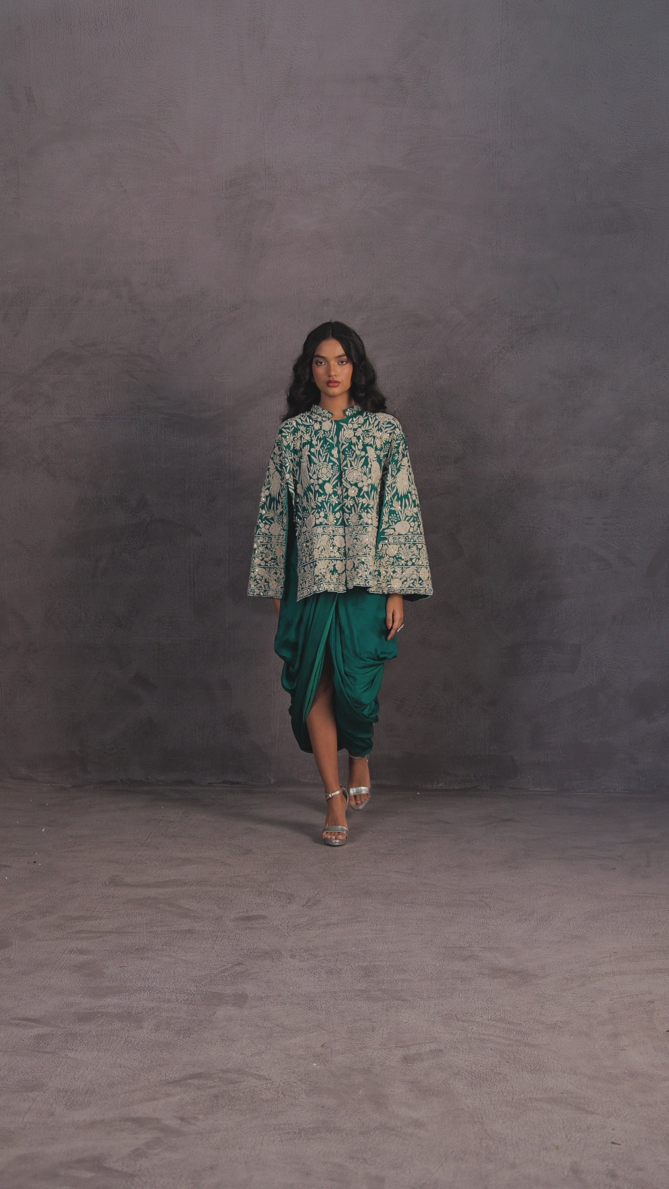 This striking ensemble is crafted in rich satin silk, featuring a deep emerald green hue. The statement jacket showcases intricate thread work, beautifully enhanced with sequins, beadwork, and cut dana embroidery in a floral pattern. Paired with stylish draped skirt style bottoms, this look merges traditional craftsmanship with modern elegance.