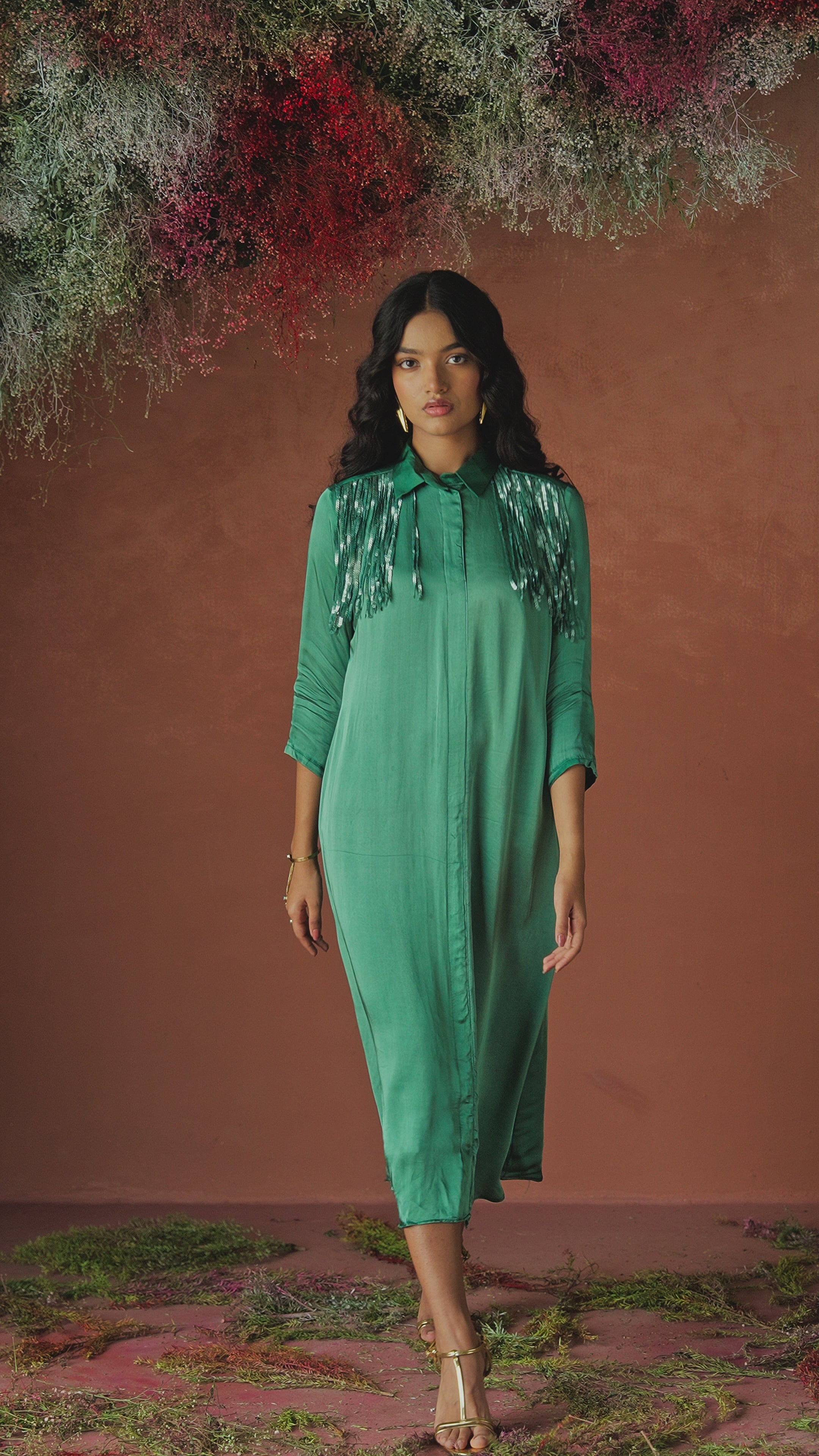 Flowing in luxurious satin silk, this ocean teal dress captures both grace and movement. Delicate sequin hangings cascade from the shoulders, adding a touch of shimmer and drama. With a relaxed silhouette and soft sheen, it's a perfect blend of effortless elegance and contemporary flair.