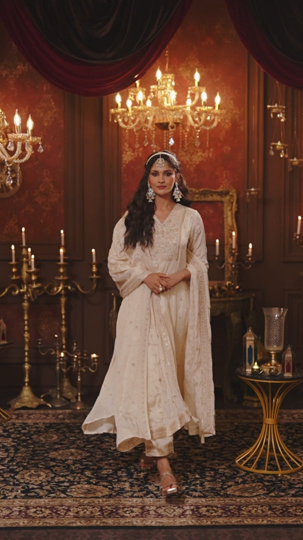 Make a dazzling entrance in this vibrant Off-White Pant Set. This three-piece ensemble, crafted from flowing Chinon silk, features an Anarkali kurta with a beautifully hand-embellished yoke. The rich metallic Zari and sequin work is mirrored on the sheer dupatta, which is intricately embroidered along the borders, enhancing the set's festive and elegant charm.