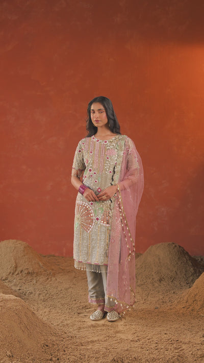 This beautiful light grey kurta and pant set is a true work of art, featuring a rich mix of intricate embellishments. The ensemble is adorned with sparkling sequins, beads, and delicate embroidery thread work, as well as unique accents like seashells and mirror work. Paired with a soft pink embellished net dupatta, the outfit is an elegant blend of subtle color and lavish detail. This look is perfect for a festive occasion where you want to stand out with sophisticated style.