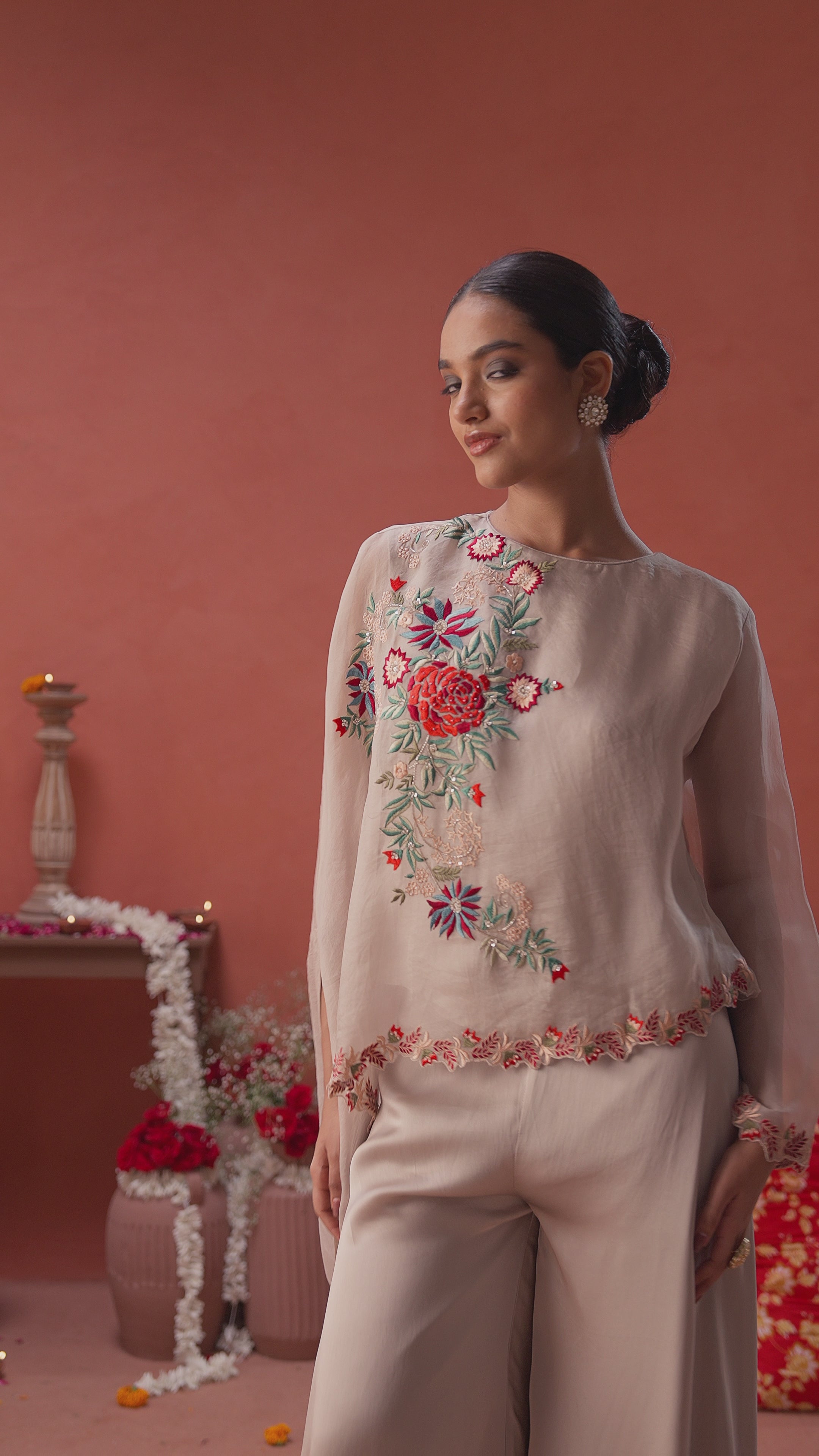 This stylish off-white co-ord set includes a delicate organza silk top with bell sleeves, adorned with beautiful embroidery, sequins, and cut dana work. The top is perfectly paired with flowy satin silk palazzo, creating a chic and modern two-piece ensemble that is both elegant and comfortable.