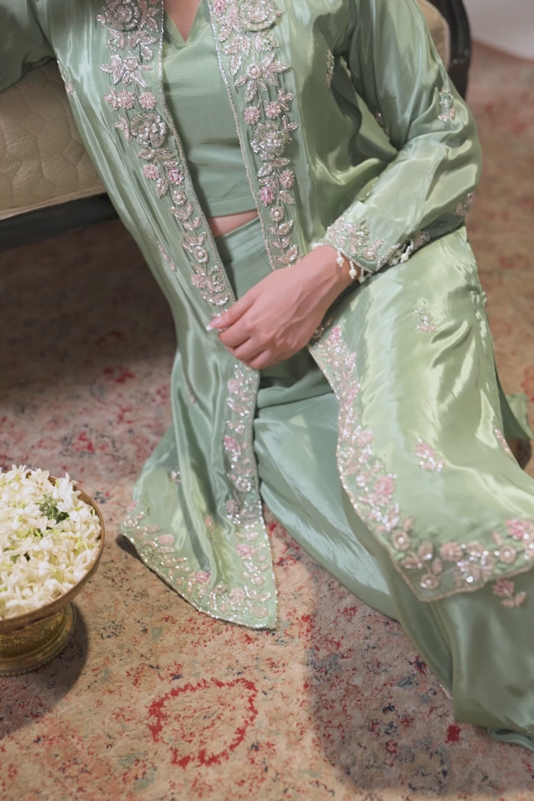 Elevate your ethnic wardrobe with this elegant Sage Luxe Cape Set, crafted from a lustrous fabric that flows with effortless grace. The ensemble features a sleeveless V-neck crop top, flared palazzo pants adorned with delicate floral embroidery, and a long open-front jacket enriched with intricate hand-embellished detailing along the borders and cuffs.