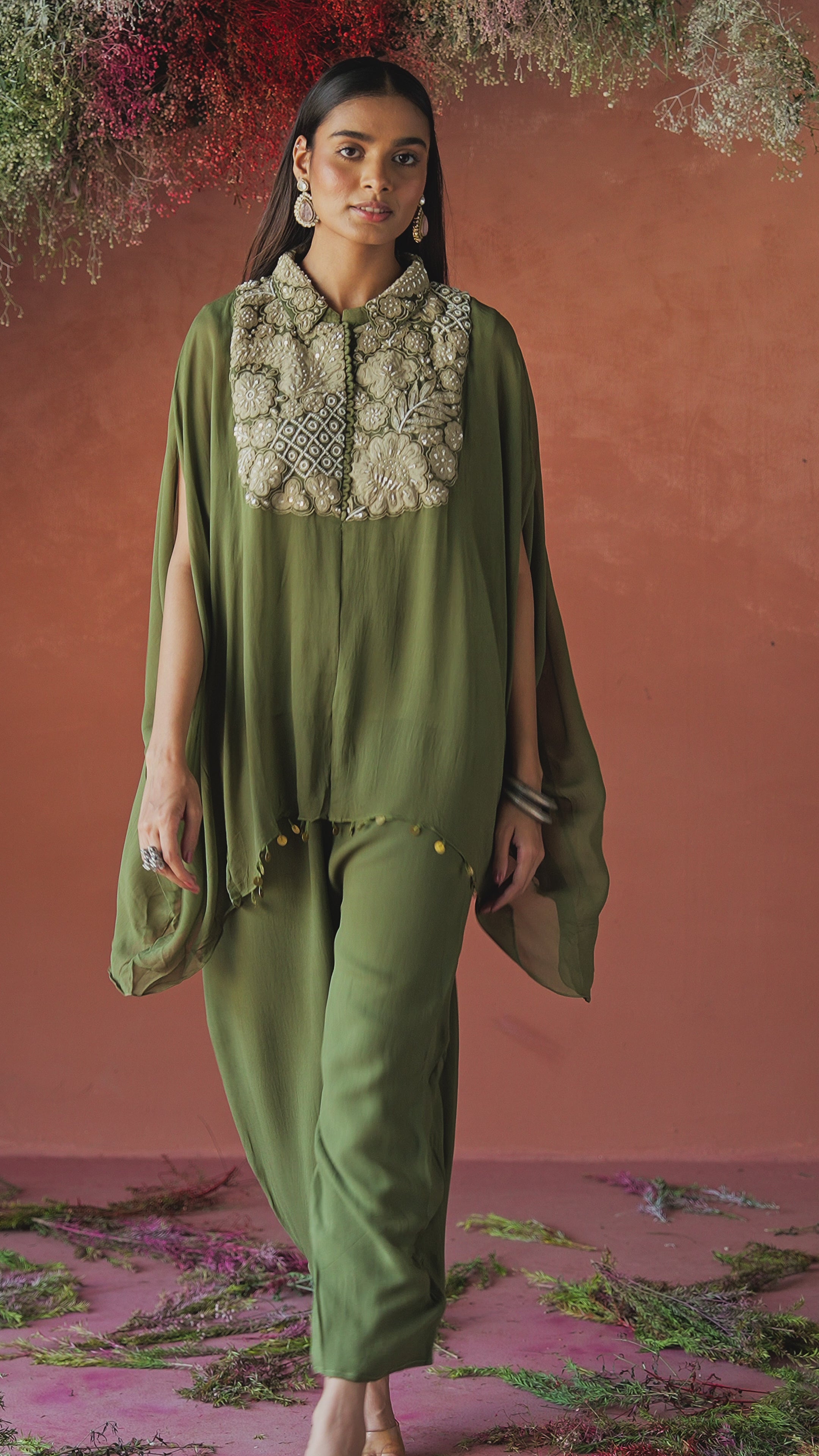 Elevate your festive look with this olive green georgette kaftan set, featuring an intricately embellished neckline with patchwork, sequin, bead, and thread embroidery. The hemline is adorned with delicate coin and sequin detailing, adding a playful charm. Paired with solid color plain pants, this set offers comfort with a statement silhouette. Perfect for intimate celebrations and festive gatherings.